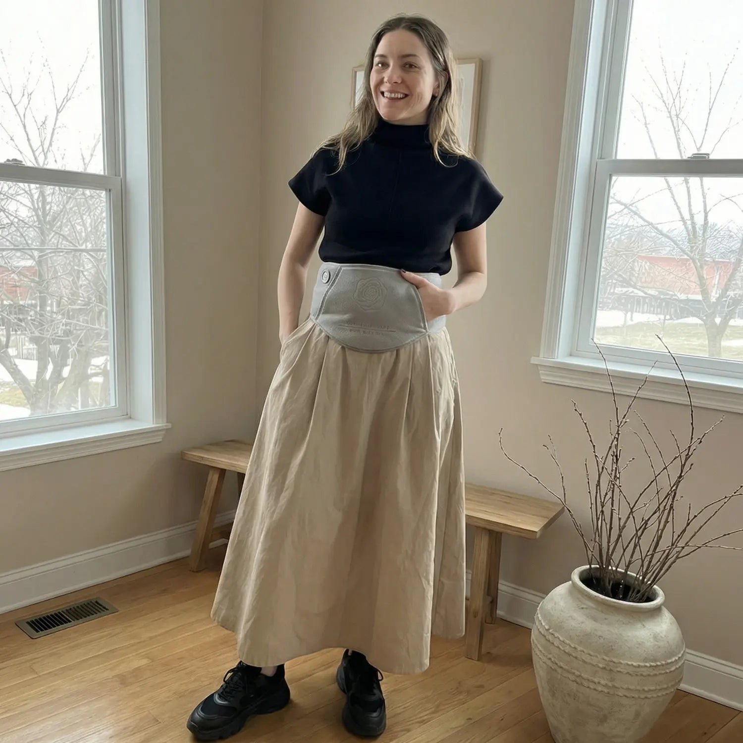 Die praktischen Kängurutaschen am Wärmegürtel sorgen für zusätzliche Isolation und bieten Platz, um bei Bedarf die Hände zu wärmen, und ermöglichen so maximalen Komfort sowie zuverlässigen Kälteschutz im Alltag und unterwegs.