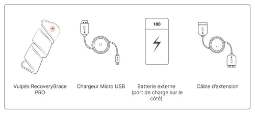 Pour utiliser le bandage Vulpés, connectez la batterie externe ou le câble USB fourni. Enroulez ensuite le bandage autour de la zone souhaitée et activez la chaleur soit via le contrôleur à 3 modes, soit depuis l’application Vulpés sur votre smartphone.